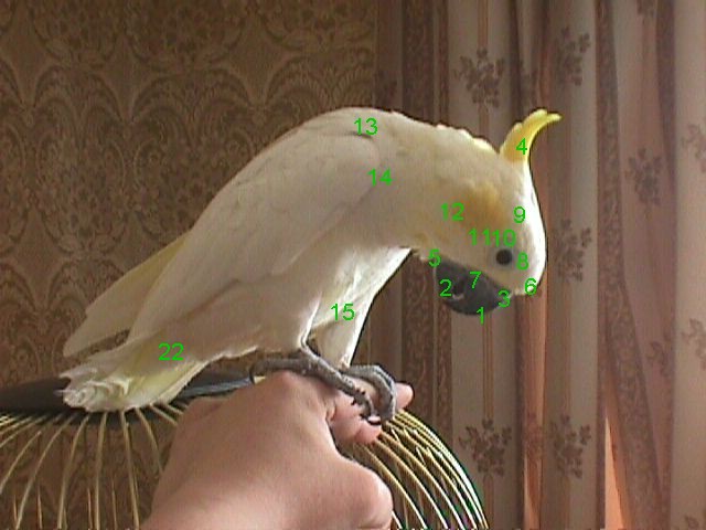 1-надклювье; 2-подклювье;3-восковица;4-хохол; 5-подбородок;7-уздечка;8-верх головы; 9-затылок;10-область уха;11-щека;12-шея ;13-спина;14-плечо; 15-брюхо;22-подхвостье;
