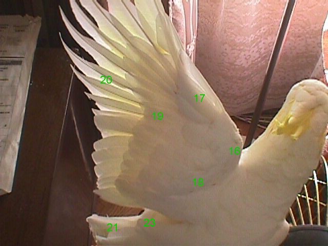 16-малые кроющие крыла;17-средние кроющие крыла; 18-большие кроющие крыла;19-второстепенные маховые;20-первостепенные маховые; 21-рулевые перья;23-надхвостье;